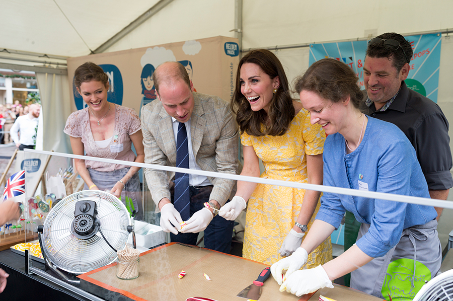 Anschließend fuhr das Paar in die Altstadt. Auf dem Marktplatz wurden William und Catherine von Prof. Würzner und seiner Ehefrau Janine empfangen. Das royale Paar nahm sich dann 40 Minuten Zeit für einen Rundgang über den deutsch-britischen Freundschaftsmarkt. Der Herzog und die Herzogin sahen dem Heidelberger Bäcker Andreas Göbes beim Brezelbacken zu, lernten Mitglieder des Freundeskreises Heidelberg-Cambridge kennen und besuchten Marktstände der Gärtnerei Grieser aus Handschuhsheim und des Heidelberger Winzers Andreas Bauer. Bei den Machern der Limonade „Heldenpause“ ging es um eine entspannte Erfrischung, beim Stand der Bonbonmanufaktur um zuckersüßen Genuss. Das Landschafts- und Forstamt der Stadt zeigte die Vorzüge von Heidelbergs Naherholungsgebieten und die Holzskulpturen seines Mitarbeiters Jonas Roth. Die deutsch-britische Gesellschaft komplettierte den Rundgang mit einer britischen Gartenparty.