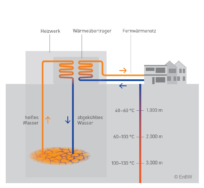 Bei der Technologie werden in Tiefen von rund 2.000 bis 4.000 Metern wasserführende Schichten angezapft. Das heiße Thermalwasser wird an die Erdoberfläche gefördert und kann dort in Heizwerken zur Einspeisung der Erdwärme in das Fernwärmenetz genutzt werden. Das Landesforschungszentrum Geothermie (LFZG) hat auf seiner Webseite eine umfangreiche Fragensammlung bereit gestellt. Das LFZG ist eine unabhängige Einrichtung des Landes Baden-Württemberg mit dem Ziel, Forschung, Lehre, Ausbildung und Technologieentwicklung zur Nutzung der Erdwärme im Land fachübergreifend zu fördern – als Beitrag zur Versorgungssicherheit und Nachhaltigkeit im Einklang mit den Klimaschutzzielen des Landes.