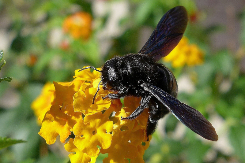 Die Große Blaue Holzbiene (Xylocopa violacea) ist ebenfalls eine Wildbiene. Sie fällt durch ihre Größe und den gesamten blaugrün-schimmernden Körper einschließlich der Flügel auf. (Foto: Lang)