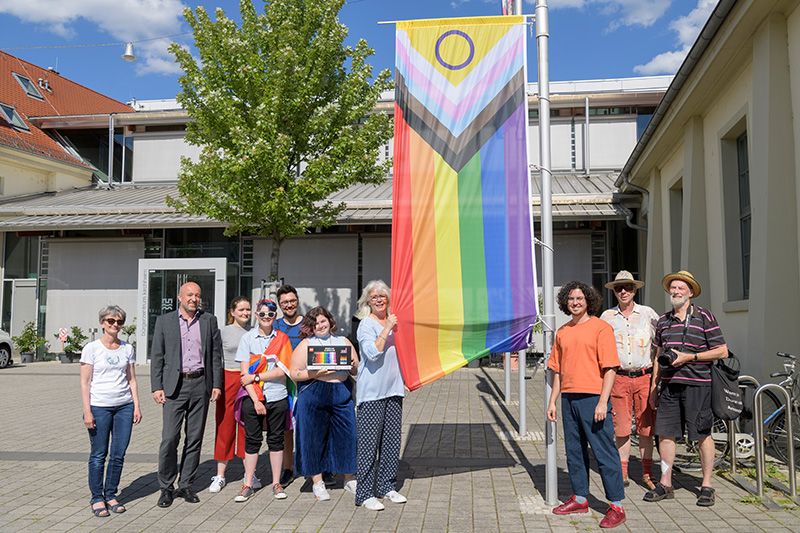 Im Juni weht in Kirchheim vor dem Bürgerzentrum eine neue inklusive Regenbogenflagge, die sogenannte „Progress Flag“. Sie wurde am 1. Juni 2022 von der Jugendgruppe „Queer Youth“, Marliese Heldner und Werner Mechler vom Stadtteilverein Kirchheim, Vertreter*innen des Internationalen Bund (IB) Heidelberg und Marius Emmerich von der städtischen Koordinationsstelle LSBTIQ+ feierlich gehisst. Die Flagge erweitert die ursprüngliche Regenbogenfahne um weitere Farben und Symbole und steht damit für noch mehr Inklusion.
