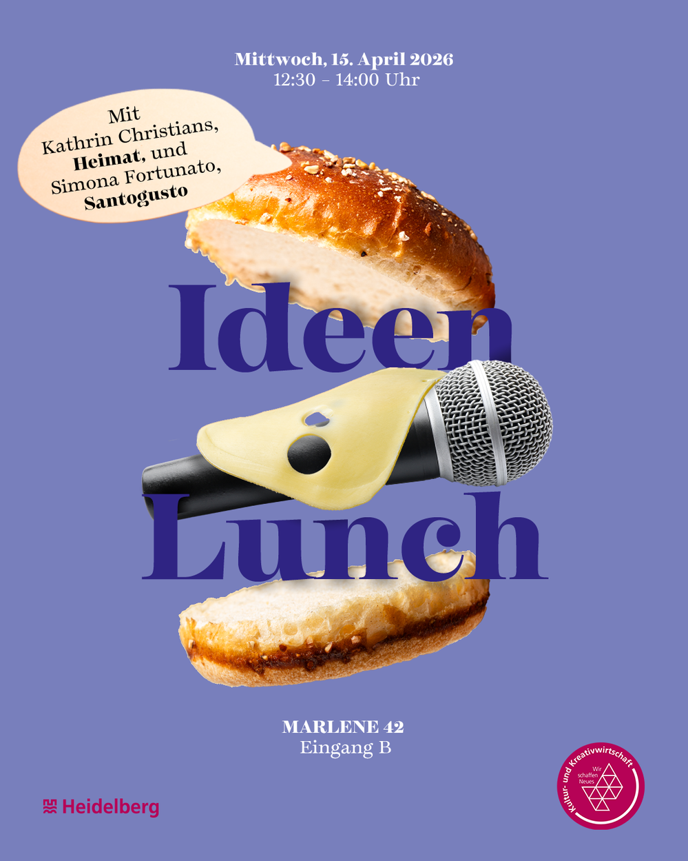 Der „IdeenLunch“ bringt jeden Monat Kreativschaffende, Unternehmerinnen und Unternehmer sowie Interessierte aus Heidelberg und der Region zusammen – zum Netzwerken, Austauschen und gemeinsamen Weiterdenken. Ein vegetarisches und veganes Mittagessen wird zum Selbstkostenpreis angeboten. Eine Anmeldung ist nicht erforderlich – auch spontan Interessierte sind herzlich willkommen.