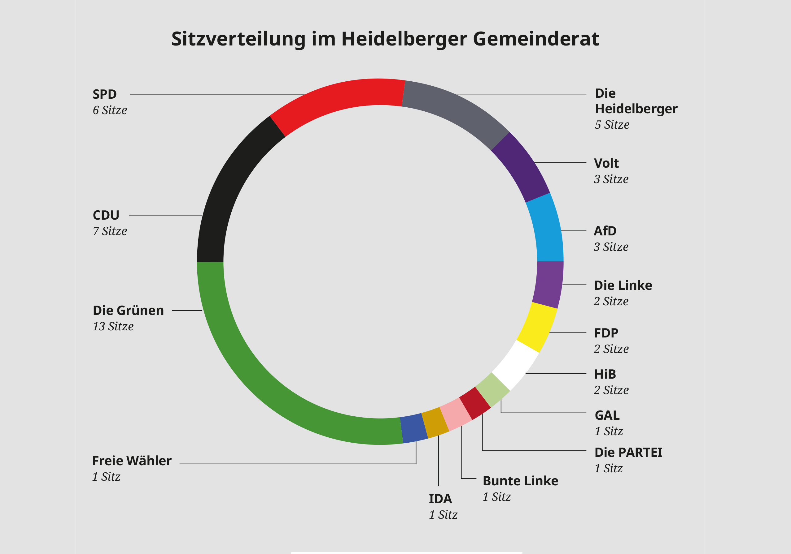 Im Gemeinderat vertreten sind: Grüne (13 Sitze), CDU (7 Sitze), SPD (6 Sitze), Heidelberger (5 Sitze), Fraktionsgemeinschaft Volt/Heidelberg in Bewegung (HiB) (5 Sitze), AfD (3 Sitze), Fraktionsgemeinschaft Die Linke/Bunte Linke (3 Sitze), Fraktionsgemeinschaft FDP/Freie Wähler Vereinigung (3 Sitze), GAL (1 Sitz), Die Partei (1 Sitz), IDA (1 Sitz). Vorsitzender des Gemeinderats und mit einem Sitz vertreten ist Oberbürgermeister Eckart Würzner.