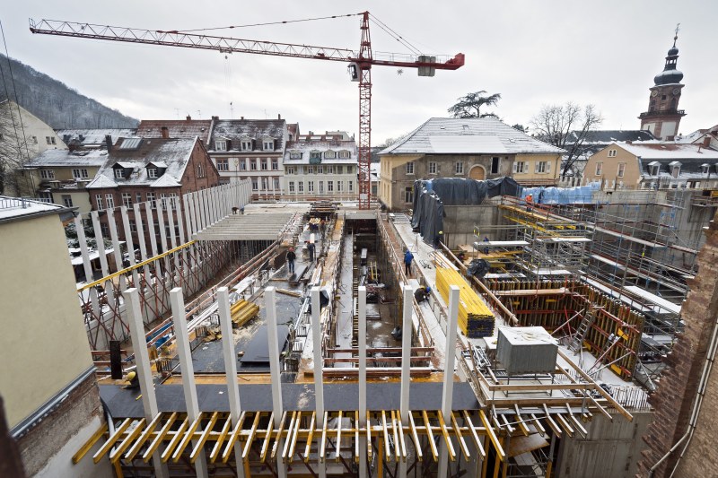 Mehr als 200 Fertigbetonteile sind auf der Theaterbaustelle bereits versetzt. Eindrucksvoll kann man das über die Webcam unter www.heidelberg.de/theatersanierung verfolgen. Bis Weihnachten sollen die Querbalken im künftigen Werkstattbereich vollständig eingesetzt sein. Auf die zwölf Meter langen und dreieinhalb Tonnen schweren Balken werden später die Decken gesetzt. In Teilbereichen der Baustelle müssen die Arbeiten bei den vorhergesagten Minustemperaturen voraussichtlich ruhen. Während Fundamente auch aufgrund der Erdwärme noch bei geringen Minustemperaturen betoniert werden können, gilt dies nur bedingt für Wände und gar nicht für Decken, die von allen Seiten der Kälte ausgesetzt sind. Im Zeitplan ist vorgesehen, die Decken der Werkstätten bis Weihnachten zu betonieren. Die Baustellenverantwortlichen entscheiden von Tag zu Tag, ob temperaturkritische Arbeiten ausgeführt werden können. Gute Nachrichten für die Anlieger der Friedrichstraße: Sie soll zwischen den Jahren vollständig für den Durchgangsverkehr geöffnet werden.