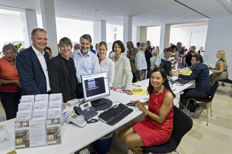 Bei der Eröffnung der Theaterkasse am 8. September 2012 (v.l.): Architekt Felix Waechter, Intendant Holger Schultze, Bürgermeister Dr. Joachim Gerner, Architektin Sibylle Waechter, Generalmusikdirektor Yordan Kamdzhalov. (Foto: Rothe)Gute Nachrichten für alle Freunde des Theaters und Orchesters Heidelberg: Die Theaterkasse ist wieder in der Altstadt, der Vorverkauf für die Spielzeit 2012/13 läuft. Eröffnet wurde die Kasse in der Theaterstraße 10 am Samstag, 8. September 2012, von Bürgermeister Dr. Joachim Gerner, Intendant Holger Schultze, Generalmusikdirektor Yordan Kamdzhalov und den Architekten Sibylle und Felix Waechter.