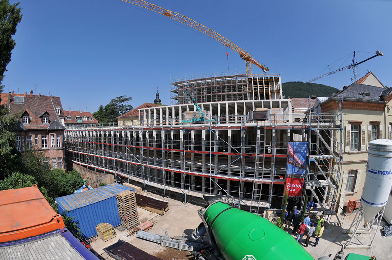 Würzner dankte außerdem der Gesellschaft für Grund- und Hausbesitz Heidelberg (GGH), den Handwerkern und allen Baubeteiligten für das bisher Geleistete. Seit Beginn der Rohbauarbeiten im März 2010 wurden rund 1.100 Tonnen Betonstahl und 6.000 Kubikmeter Ortbeton verbaut, außerdem 1.000 Stahlbetonfertigteile für tragende Konstruktionen und für Fassadenstützen. Auch den Anwohnern sprach der Oberbürgermeister seinen Dank aus. Sie hatten vor allem in der Phase des Abbruchs Lärm und Staub zu ertragen, an Spitzentagen rollten bis zu 65 LKW täglich durch die engen Gassen zur Baustelle.
