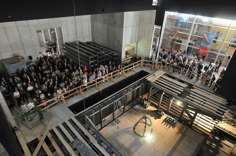 Ein wichtiger Meilenstein auf dem Weg zum „neuen“ Heidelberger Theater ist erreicht: Am 4. Juli wurde auf der Baustelle im Herzen der Altstadt das Richtfest und damit der Abschluss der Rohbauarbeiten gefeiert: Diaschau Richtfest Theater und Film Richtfest Theater. Oberbürgermeister Dr. Eckart Würzner unterstrich vor den rund 350 geladenen Gästen, dass es keineswegs selbstverständlich sei, ein solches Projekt in finanziell schwierigen Zeiten umzusetzen: „Während andernorts Theatern die Schließung droht, hat sich Heidelberg zu seinem Theater bekannt. Die breite Unterstützung des Gemeinderats und der Heidelberger Bürgerschaft haben es möglich gemacht, dieses großartige Projekt zu realisieren.“