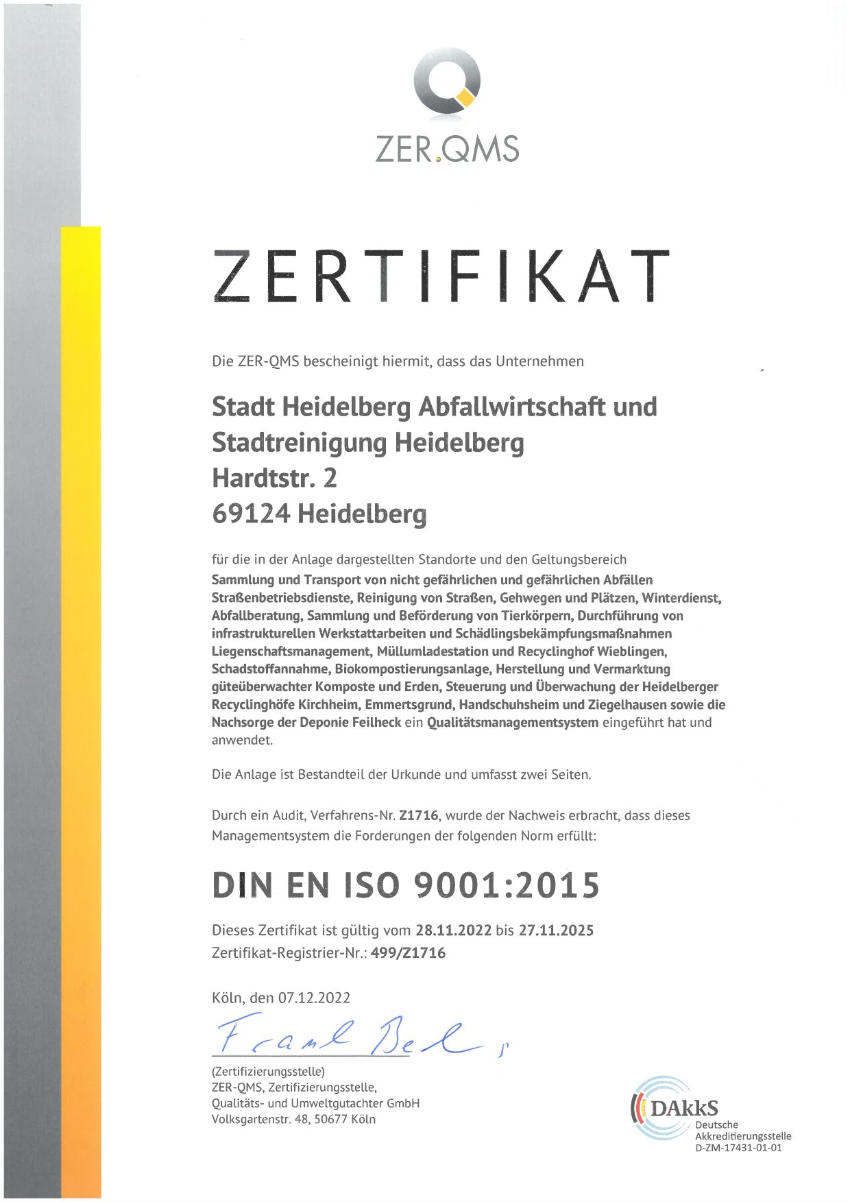 Das nach dem internationalen Standard DIN EN ISO 9001:2015 zertifizierte Qualitätsmanagement stellt ein besonderes Gütezeichen für Zuverlässigkeit, Qualität und Sicherheit dar. Das Zertifikat nach der DIN EN ISO 9001:2015 garantiert den Bürgerinnen und Bürgern bei der Abfallentsorgung und Stadtreinigung stets gleichbleibende Qualität auf hohem Niveau.