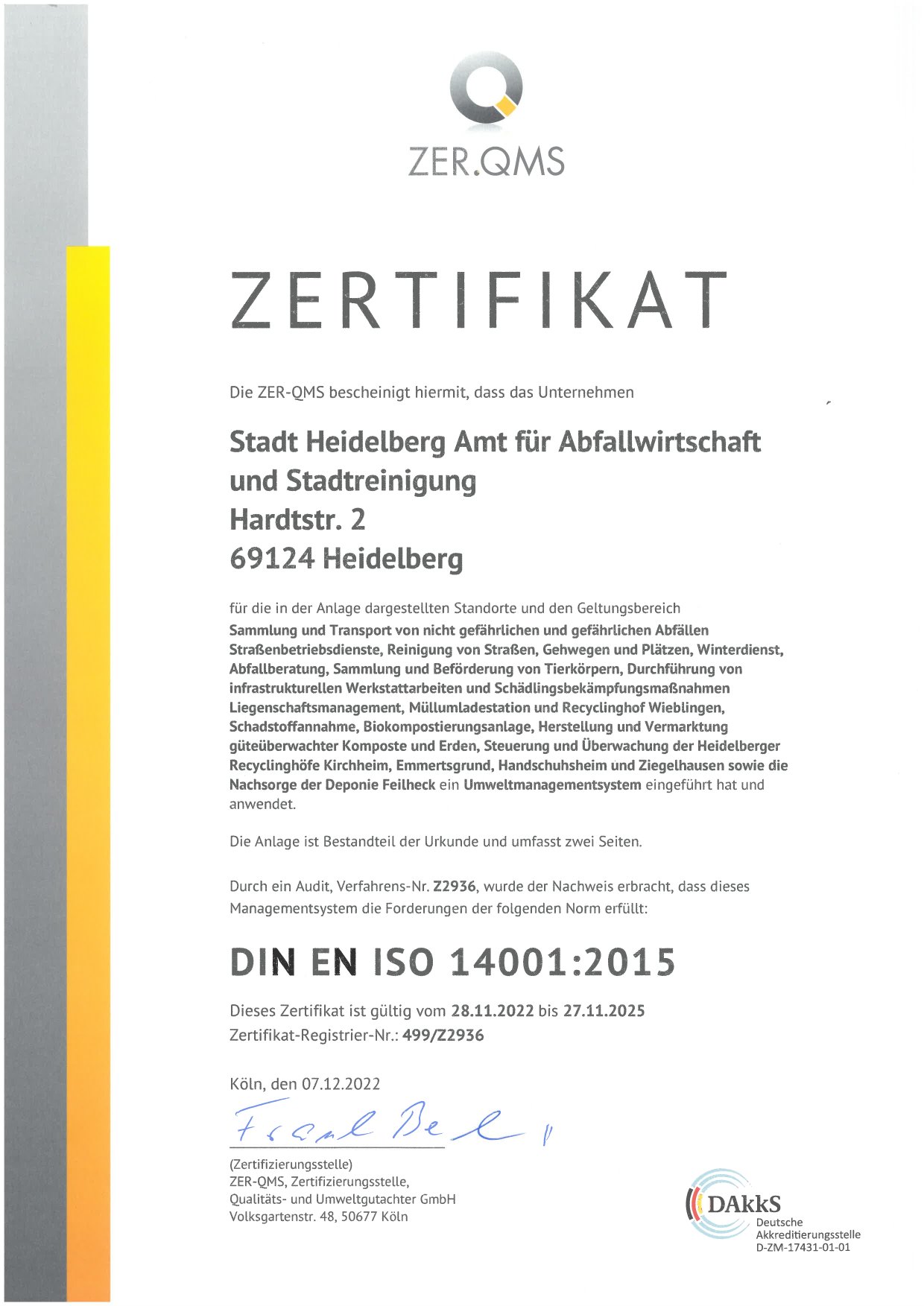 Als modernes Dienstleistungsunternehmen und als kommunaler Abfallwirtschaftsbetrieb hat die Abfallwirtschaft, Stadtreinigung und Zentralwerkstätten Heidelberg Vorbildfunktion im Bereich des Umweltschutzes. Mit der Durchführung eines Umweltmanagementsystems nach der Umweltnorm DIN EN ISO 14001:2015 hat sich das Amt dem Umwelt- und Ressourcenschutz sowie der Daseinsvorsorge verpflichtet.