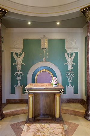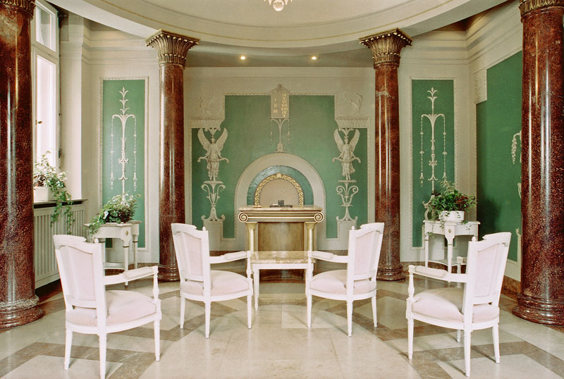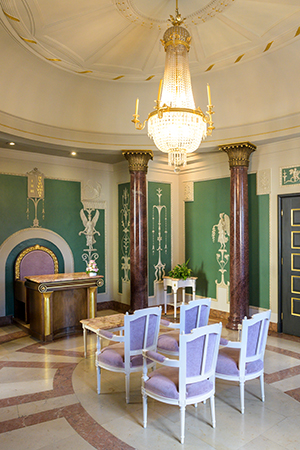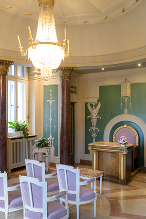 Die majestätisch anmutende Pforte zum Vorraum des Hochzeitszimmers, eingerichtet im Original Biedermeierstil, ist nur eine kleine Facette der aufwendig gestalteten Trauungsräumlichkeiten des Rathauses. Art-Deco, Jugendstil, Historismus und Neoklassizismus sind die harmonisch verknüpften Stilrichtungen, die die Brautleute im Heidelberger Trauzimmer erwarten.