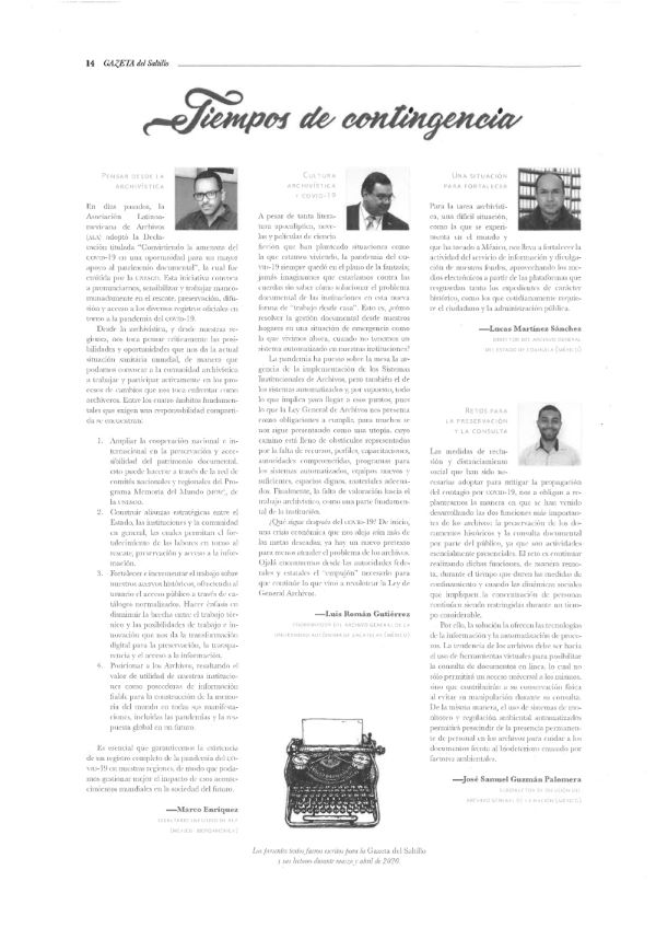 The emergency caused by Covid-19 has come to rethink the operationalization of the Archivo Municipal de Saltillo, while offering a series of challenges and opportunities based, above all, on the development of new technologies. In this sense, the implementation of electronic platforms simply represents an inclusive and democratic practice through which free access to your heritage is promoted. Point!Internet consultation platforms, such as that of the “Digital Archive” of our Mexican Archive, are a viable alternative to investigate the documents in times of pandemic. Thus, the user will be able to know, from other latitudes, the descriptions and images of the folios of his interest. This has also encouraged a renewed focus on the past and a new way of investigating it digitally, establishing an effective and fruitful link between archives and citizens.