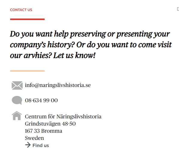 The Centre for Business History is one of the leading business archives, organized as a membership organization with some 390 company members. In short, we take care of about 7.200 archives stretching as far back as the 1680s until today, adding to that some 5,5 millions of photos and items of various sorts. Our member companies represent all branches and cover Swedish as well as international business history
