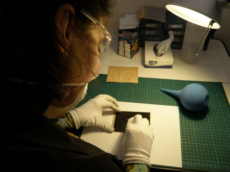 Die Mund-Nase-Maske ist weniger der Reinigung des Fotonegativs geschuldet, sondern gegenwärtig Standardutensil in den Archiven Uruguays. (Foto: Instituto de Información: Facultad de Información y Comunicación – Universidad de la República/Montevideo)