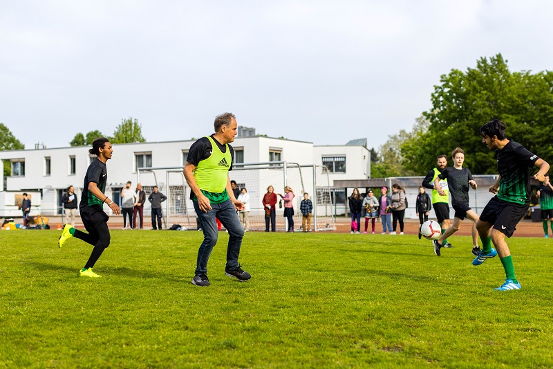 Beste Laune und voller Einsatz: Beim allwöchentlichen Fußballtunier der Berufsschulstufe an der Graf von Galen-Schule treten Schüler- und Lehrerschaft gegeneinander an. Dieses Mal als Spieler mitten drin: Oberbürgermeister Prof. Dr. Würzner.