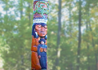 The richly detailed totem pole behind the ‘bald eagle’ table brings to mind the unbreakable bond between Man and Nature. At the same time the viewer is free to find his or her own harmony in its various contradictory images and symbols.