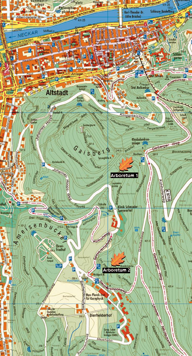 Coming by car from the city center, follow Klingenteichstraße towards Gaiberg until you reach the forest car park next to a log cabin. Walk past the log cabin and the rhododendron garden – a sea of color during the blooming reason (May to June). This path will take you directly to the entrance to arboretum 1. Arboretum 2 is reached by following the path Blockhausweg for approximately 1 kilometer starting from the forest car park, or directly from the hospital Klinik Schmieder Speyererhof, a stop on bus route no. 21.